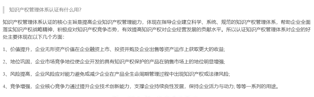 知识产权管理体系认证的核心主旨是提高企业知识产权管理能力,体现在指导企业建立科学,系统,规范的知识产权管理体系,帮助企业全...